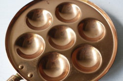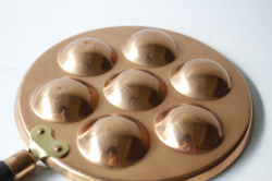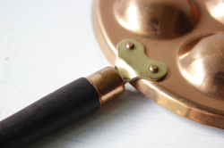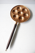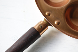デンマークで見つけたチーク×銅製のフライパンです。こちらはパンケーキの生地を丸い形のベビーカステラのように焼くためのフライパンです。飴色の美しいフライパンで、大変おしゃれでです。持ち手がチークで高級感もあり、取っ手に穴が開いているので、フックに引っ掛けてキッチンのデコレーションとしても使えそうですね。