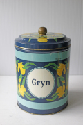 2023年に閉店したデンマークの老舗高級スーパーIrma(イヤマ)のヴィンテージ缶です。イメージキャラクターのイアマちゃんがうつむいてたたずんでいます。ブルーのワンピースに、頭には大きなリボン、クラシックで上品ですね。イアマの缶はデンマークでもコレクターが多いのです。蓋の持ち手などしっかりと凝った造りの缶でとても存在感があります。Grynは穀物の意味ですので、シリアルなどを入れてお楽しみください。