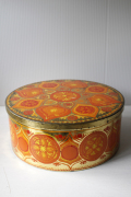 デンマーク、Ira社のヴィンテージ缶です。ゴールド地にオレンジの葉っぱやお花模様が華やかな缶です。大きめなので、お菓子や小物入れなど幅広くご活用いただけるでしょう。お部屋に飾っておくだけでも存在感のある素敵な缶です。