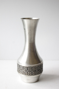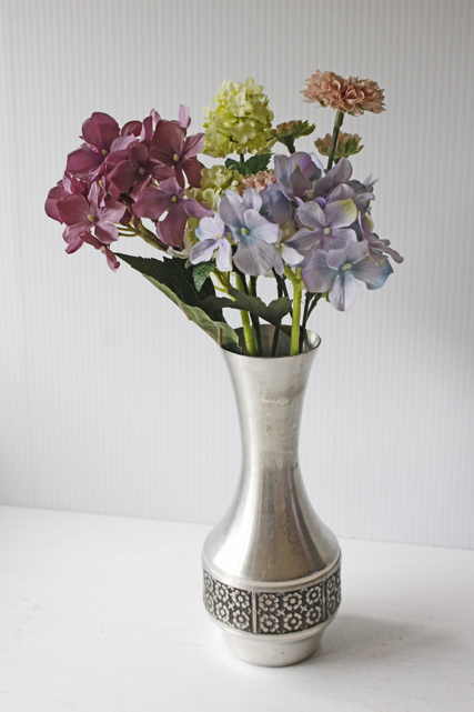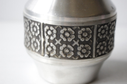ノルウェー製のピューターの花瓶です。こちらは丁寧にハンドメイドで作成された味わいのあるデザインで、フラワーモチーフが愛らしく、丸っこい作品です。ピューターがお好きな方におすすめしたい作品です。大きめサイズで迫力があります。