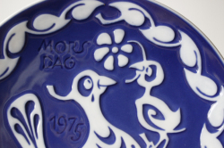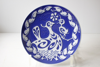 1971年から1982年までデンマーク・ロイヤルコペンハーゲンで製造されていた母の日プレートです。毎年違った国のお母さんをモチーフにデザインされていたようです。1975年のタイトルは、「Fugliredemed unger(巣の中の鳥とその子)」。小さな小鳥が大きなお花を母鳥にプレゼントしようとしている可愛らしいデザインです。