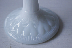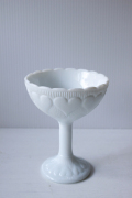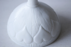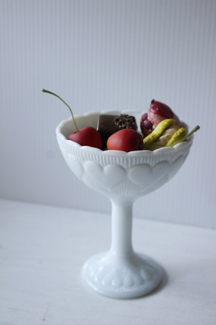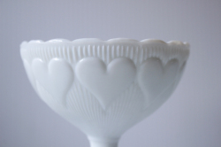 デンマークで見つけたガラスの足つきボウルです。足つきの優雅なフォルムに、ぷっくりとしたハートがデザインされています。ミルクガラスの優しい雰囲気で、お菓子やデザートなど盛り付けるのにぴったりなお品です。