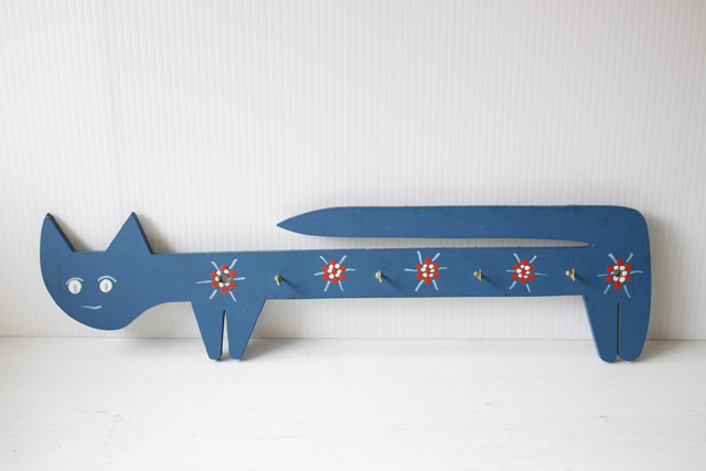 デンマークで見つけた壁掛けフックです。こちらはハンドメイドで作られた青い猫ちゃんのデザインで、40cmと長さがありますので、迫力があります。壁に掛けるオブジェとして楽しみつつ、機能的にフックとしても使える、レトロなデザインでおすすめです。