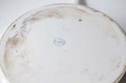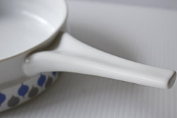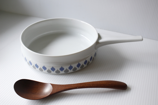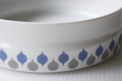 1936年~1969年という短い間しか存在しなかった、デンマークのLyngby Porcelain(リュンビュー・ポーセリン)のハンドル付きボウルです。こちらは可愛らしい雨粒のようなドロップ模様が幾何学模様的に配列されています。ブルーとグレーのコンビネーションが大変おしゃれです。耐熱でオーブン使用可能です。