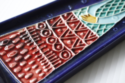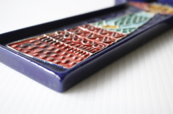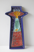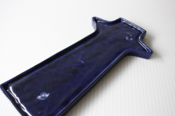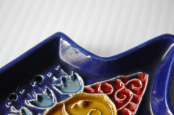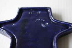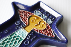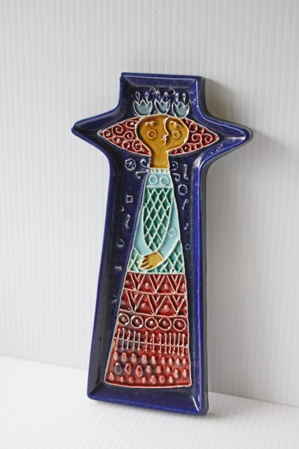 フィンランドに1921年から1969年まで存在したKupittaan savi社製のデコレーションプレートです。こちらはドレスを着て佇んでいる女の子のモチーフでバックグラウンドのネイビーブルーとドレスの色合いが美しく、またフォルムも女の子のユニークなヘアスタイルに合わせてデザインされており、個性的です。あまり数の出回っていない作品ですので、北欧雑貨のコレクションの一部に大変おすすめです。軽いので、壁にも飾りやすいです。