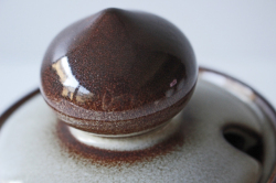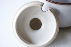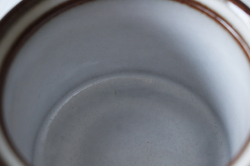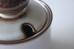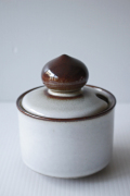 デンマーク、Soholm(スーホルム)のソニアシリーズのシュガーポットです。ぽってりとした厚みのあるフォルム、ミルク色の地にブラウンの釉薬ががアクセントになっています。持ち手の丸いデザインが可愛らしく、素朴な雰囲気で、土の温かみが感じられる作品です。