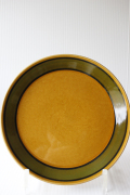1960年代にFiggioと合併したノルウェーのStavangerflint(スタヴァンゲルフフリント)社のプレートです。デザインは、当時大変人気のあったデザイナー、Inger Waageによるものです。Waageは、華麗なハンドペイントの作品群でも知られ、その作品は今もコレクターの対象となっています。こちらはマスタードカラーの地にモスグリーンとブラウンの太めのストライプが描かれている絵付け師さんの筆跡が感じられる温かみのあるデザインです。すっきりとしたモダンなフォルムは男性がお使いになっても素敵な雰囲気です。市場でもなかなか見かけないデザインでお勧めです。