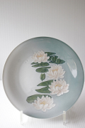 デンマークの老舗陶器メーカー、Bing&Groendahlのプレートです。B&Gは、1853創業の老舗陶器メーカーで、ロイヤルコペンハーゲンに吸収合併された後も素晴らしい作品を作り続けています。今回入荷分は、蓮の葉っぱに蓮の花がデザインされたエレガントな雰囲気です。大輪の華やかな蓮の花が色合いも優しく、大変おすすめです。こちらは市場でもなかなか見かけない珍しいお品になります。裏面に壁掛け用の穴が開いていないのでお皿立てで飾っていただくのがおススメです。