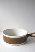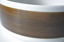 スウェーデン、Rorstrand(ロールストランド)の「KOKA」(男の子の意)シリーズ、ブラウンのボウルです。Hertha Bengtsson(ヘルサ・ベングトソン)デザインの人気シリーズです。清々しい白磁に温かみのあるブラウンの魚がユーモラスにぐるりとデザインされています。ハンドル付きでキュートなフォルムですので、食卓にも映えるおすすめのボウルです。耐熱でオーブン使用可なのでグラタンにもお使いいただけます。
