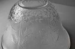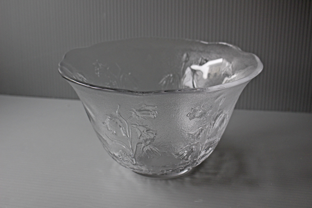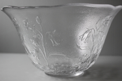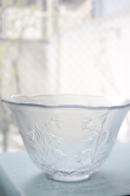 デンマークで見つけたヴィンテージのガラスの器です。こちらは高さのあるボウルで、ぐるりには素朴で可憐な野花がデザインされており、ロマンティックな印象です。フルーツやサラダなどを盛り付けて食卓でお楽しみください。
