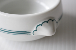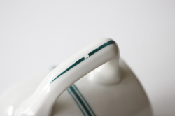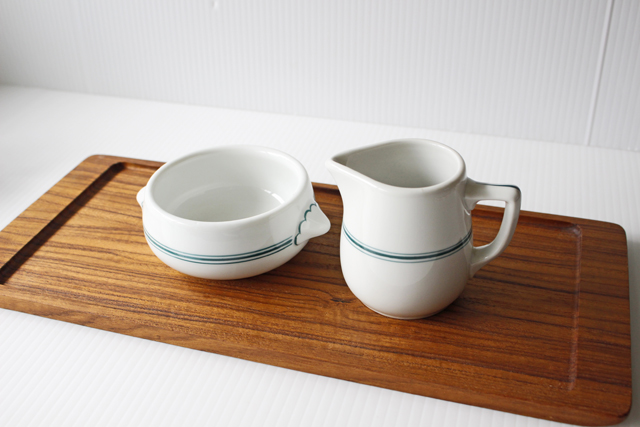 デンマーク、Royal Copenhagenのシュガーボウルとクリーマーのセットです。こちらはつるんとした滑らかな素材にハンドペイントのグリーンのラインが描かれています。ボウルは耳付きのデザインで、プクプクとしたラインが描かれており、ポップな印象です。シュガーボウル、クリーマーとしてだけではなく、キャンディやちょっとちたおつまみ、ドレッシングなどアイデア次第で多様にお使い頂けそうです。爽やかなデザインがシンプルな食卓にぴったりです。画像の木製トレイは撮影備品で商品に含まれません。