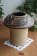 デンマークの小さな島(ボーンホルム島)に1835年から1996年まで存在した名窯Soholm(スーホルム)のフラワーベースです。どっしりと重みのある珍しいキノコのようなフォルムに四葉のクローバーやペイズリー模様など女性らしいデコレーションが施してあり、単色づかいでありながらどこか愛らしい雰囲気があります。下部はあえて土のざらざらした質感を残して味わいある雰囲気に仕上げてあります。お花を生けてもまたオブジェとして飾っていただいても存在感があり、素敵にお部屋を演出してくれます。スーホルムの作品は和式にもしっくりくる飽きのこないデザインが多く、ずっと大切にしたい作品になるでしょう。