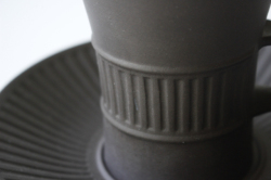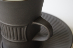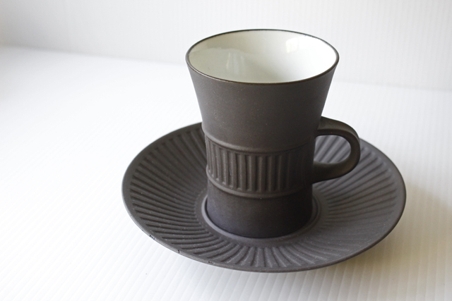 デンマーク、Jens.H.Quistgaard(イェンス・クイストゴー)デザインFlame Stone(フレームストーン)シリーズのカップ&ソーサーです。フレームストーンは、1957年にDANSKより発表されました。独創的なフォルム、味わい深いマットな質感と内側の白いコントラストが素敵です。クイストゴー本人もアトリエ兼自宅で愛用していたことでも有名です。こちらのシリーズはラッパのように口の開いた大きめのカップで、市場でも流通量が少なく、また繊細な陶器のためコンディションのよいものが入荷するのは稀なのでお探しの方はお見逃しなく!