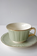 フランス製、ビレロイボッホ社のカップ&ソーサーです。こちらはミントカラー&ゴールドの縁取りがノスタルジック且つ、クラッシックな印象です。マカロンなど、ガーリッシュなティータイムが似合いそうです。ドイツの陶器メーカーですが、工場のあったエリアが長い歴史の中でフランス領になった時期もあり、その時代に製作された作品はフランス製の刻印が入っています。1940後半から1950年代半ば頃と短い期間ではありますが、フランス製のビレロイボッホが残っているのです。ヴィンテージのテーブルコーディネートにピッタリの作品でおススメです。