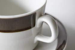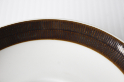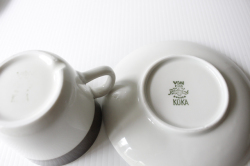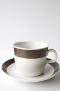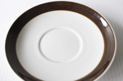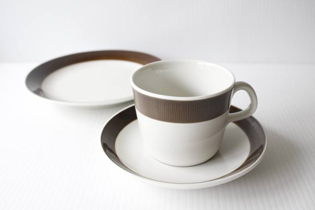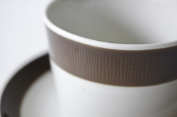 スウェーデン、Rorstrand(ロールストランド)の「KOKA」(男の子の意)シリーズ、ブラウンのカップ&ソーサーです。Hertha Bengtsson(ヘルサ・ベングトソン)デザインの人気シリーズです。清々しい白磁に爽やかなチョコレート色の帯のコントラストが素敵です。