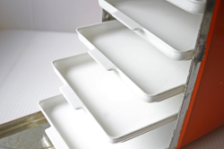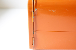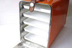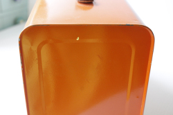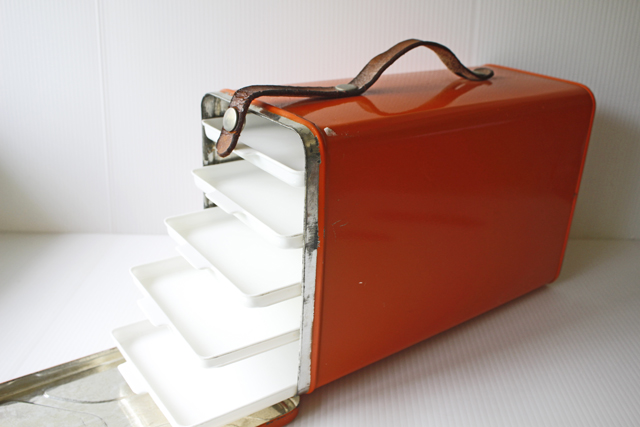 デンマークで見つけた、珍しいブリキのピクニックボックスです。デンマークでは、スモーブローというオープンサンドイッチがよく食べられます。そのオープンサンドイッチを重ねずにきれいな状態で持ち運ぶためのものだと思われます。内部は階段状に薄いトレイがついており、そこにサンドイッチをのせます。取り出しも、トレイがスライドして出せるので便利です。インテリア雑貨としてお部屋に飾るのもよし、またトレイを出して小物をディスプレイするのにお使いいただいてもよいでしょう。