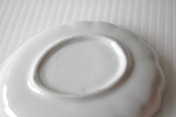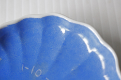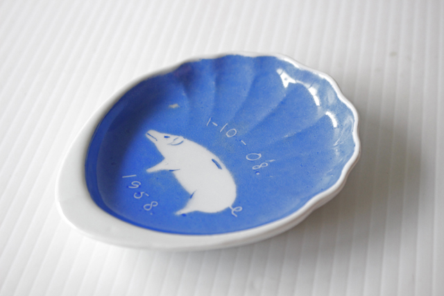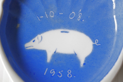 デンマークで見つけた小皿です。こちらは貝殻のようなフォルムにステンシルで可愛らしい豚ちゃんモチーフがデザインされています。ペールブルーが美しく、小物などを乗せるのにピッタリです。1958年製作です。