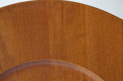 デンマーク製、チークのラウンドプレートです。寄木作りで木目も個性があります。直接パンを置いてもいいですし、カップを置いてクッキーやパウンドケーキなどを盛り付けても味わいがあって素敵ですよ。リムが大きめに彫られており、お気に入りのオブジェなどを飾るのにもぴったりです。