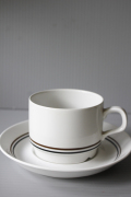 スウェーデン、Rorstrand(ロールストランド)の「Sierra」シリーズのカップ&ソーサーです。こちらはシンプルなフォルムに落ち着いたチョコレートブラウンのラインが引かれたデザインで、スタッキングも出来、とても機能的な作品です。1950年代に作られたシンプルなデザインは今のティータイムでもしっくりとし、男性にもおすすめです。