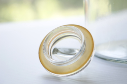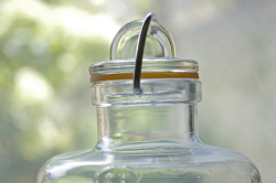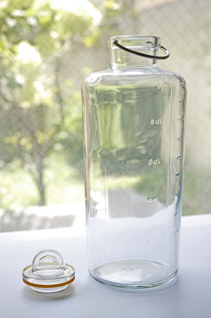 フィンランド、Riihimaen社の密閉ができる蓋付きの保存ボトルです。1910年創業のリヒマエン社は、主に家庭用のボトルやケースを製造していたガラスメーカーです。中でもこちらの保存容器は、開閉の仕組みにもデザイン性が感じられ、キッチンに飾っておきたくなります。底にはリヒマエン社のトレードマークのオオヤマネコがデザインされています。1デシリットルごとにメモリがついているので、オリーブオイルやミルクを保存するのはとても便利かもしれません。