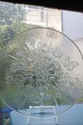 スウェーデン、コスタボダ製のディナープレートです。美しいクリアガラスに野花や蝶々などが施されているロマンティックなプレートで、お菓子やお料理など幅広く使って頂けそうです。特大サイズですので、大人数のおもてなしにぴったりです。