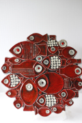 スウェーデン、GUSTAVSBERG(グスタフスベリ)の陶板です。1950年代~1980年代に掛けて同社にデザイナーとして在籍したBritt Louise Sundellのデザインです。こちらの作品は1970年代に制作された陶板で、彼女の代表作でもあり、丸みを帯びたフォルムの中にぎっしりと魚モチーフがデザインされています。目のクリっとした可愛らしい大小の魚たちが左右上下に列に並んでおり、真っ赤な色味はとても目を惹きます。市場でもなかなか見かけないとても珍しい作品ですので、コレクションにもおすすめです。