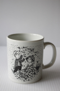 デンマークの人気デザイナーBjorn Wiinblad(ヴョルン・ウィンブラッド)のマンスリーマグカップです。こちらのシリーズは1月から12月までの1枚1枚に男女の出会い、結婚、妊娠、出産までを四季を交えながら描いています。10月のテーマは「PARADIS」。木に実った果物を2人でつみにきたほのぼのした様子が描かれています。女性のお腹は少しふっくらとしていて、二人の間に新しい命が宿ったことを予感させます。
