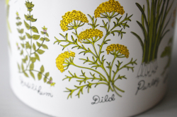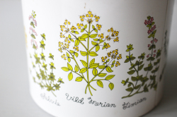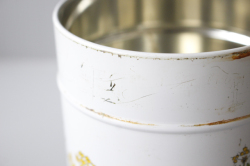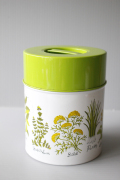 ヴィンテージのレトロ缶です。こちらはホワイトの本体に若草色の蓋、本体にはハーブの草花がぐるりと描かれています。優しいタッチのイラストで、キッチンに飾りながら収納するのにぴったりのサイズでおすすめです。