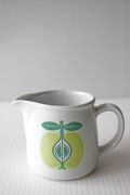 フィンランド、アラビア社で1960年代にRaijaUosikkinenがデザインした、クリーマーです。こちらはコロンとした安定のよいフォルムに、青りんごがデザインされています。クリーマとしてだけでなく、パンケーキなどのシロップやサラダのドレッシングなど多様にお使い頂けそうです。爽やかな青リンゴが食卓を彩ってくれそうなおすすめの作品です。