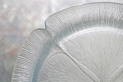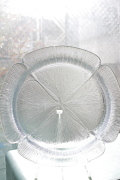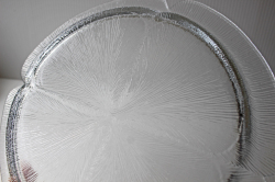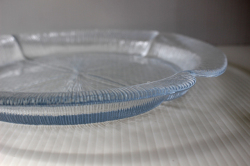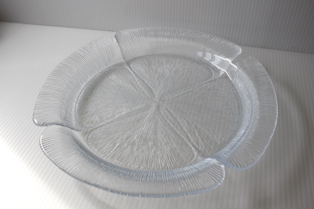 デンマークの王室御用達ブランド、Holmegaardのガラスのサービングプレートです。こちらはクローバーのようなお花のモチーフになっていて、大きさがありますので、存在感があります。厚みのあるしっかりとした素材で、様々な料理を盛り付けるのにぴったりの作品です。