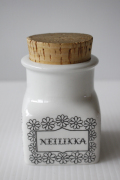 フィンランド、ARABIA/Esteri Tomula/エステリ・トムラのデザインした、スパイスポットです。エステリ・トムラは、1947年~1984年まで長きにわたりアラビアで活躍した装飾デザイナーです。シンプルなフォルムに可愛らしいフラワーモチーフの縁取りにスパイスの名前が入っています。キッチンに飾ると大変可愛らしくおススメです。