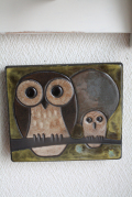 デンマークのアンティークショップで見つけたヴィンテージの陶板の壁掛けです。小さな飾りやすいサイズで、愛らしい表情のフクロウの親子がデザインされています。フクロウはデンマークで人気のモチーフで、あらゆるグッズをよく見かけます。ほのぼのと幸せな気持ちになる可愛らしいモチーフですのでお部屋や玄関先などの雰囲気を和ませてくれるでしょう。裏には壁に引っ掛けられるように穴が開いています。