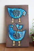 デンマーク、Knabstrup社の陶板の壁掛けです。こちらは小鳥の親子が仲良く戯れている様子がデザインされています。ダークブラウンの素焼きの地にターコイズブルーのガラス質の釉薬のかかった部分が際立って味わいある作品となっています。裏面にカケがありますが、素焼き部分のカケなので、彩色部分に比べると目立ちにくいです。ヴィンテージの味としてみていただければと思っています。モチーフやガラス質の釉薬が掛けてある部分はきれいです。裏面の引っ掛け部分にもカケがありますので、立てかけて飾っていただくとよいと思います。