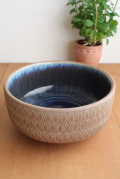 デンマーク、Michael Andersen & Son社の花瓶です。側面は素焼きにシンプルな葉っぱ模様がデザインされています。内側にはダークブルーのガラス質の釉薬がたっぷりと流し込まれていて対比がとても美しい作品となっています。深鉢なので、煮物を盛り付けてもよいでしょう。