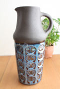 デンマークの小さな島(ボーンホルム島)に1835年から1996年まで存在した名窯Soholm(スーホルム)の持ち手つき花瓶です。どっしりとした大き目の花瓶で存在感があります。上部はマットに仕上げられ、下部は幾何学模様の上からペールブルーの釉薬がたっぷりとかけられておりその流れ落ちる釉薬の景色もまた味わいの一つとなっています。