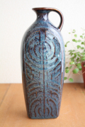 スウェーデン、Rorstrand(ロールストランド)の持ち手つき花瓶です。スリムなフォルムに、小さめのおちょぼのような口から流れるような曲線で持ち手が付けられています。側面には幾何学模様が立体的にデザインされており、ブラウンの上からペールブルーの釉薬がたっぷりとかけられています。大き目のサイズで、存在感もありインテリアのアクセントにいかがでしょうか。