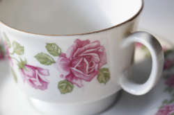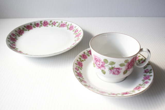 スウェーデン、Upsala Ekebyのカップ&ソーサーです。淵回りにぐるりとデザインされた薔薇モチーフがレトロ懐かしく、可愛らしい印象です。