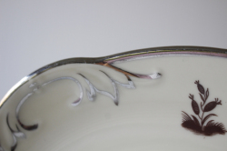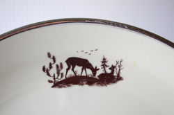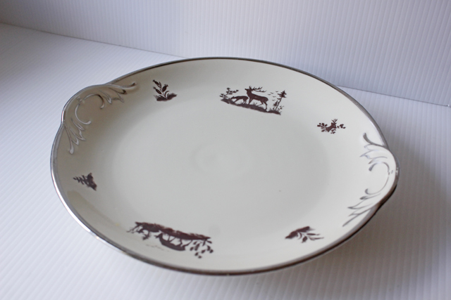 デンマーク、Koebenhavns Porcelaensmaleri社のサービングプレートです。クリーム色のような柔らかな地色に鹿の親子が影絵のようにデザインされており、ノスタルジックな印象です。レースやシルバーなどと一緒に、また現代ものの陶器と合わせたり、レトロヴィンテージの小物とのミスマッチを楽しむデンマークの若い世代にも人気があります。縁周りは銀彩が使われており、シックな印象です。