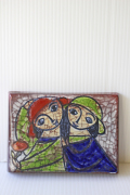 デンマークのMichael Andersen & Son社の陶板の壁掛けです。デザインは数々の女性らしい柔らかな作品を生み出したMarianne starckになります。こちらの作品は、2人の少女が頬を寄せ合ったモチーフで釉薬を貫入に染み込ませ個性的な仕上がりになっています。こちらはドイツ/ブリュッセルの世界万博で金賞を受賞したPersia Techniqueと呼ばれる貫入による独特の技法が使われています。小ぶりの飾りやすいサイズでお勧めです。