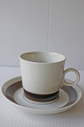 スウェーデン、Rorstrand(ロールストランド)FORMAシリーズのカップ&ソーサーです。ツヤのあるピュアホワイトの地にブラウンのラインが上品な雰囲気です。ぷくぷくの水玉模様が前面にデザインされた作品で、どんな食器とも相性がよく、デイリーでお使いいただけるでしょう。カップはスタッキングが出来るので、収納に便利です。画像右側の商品のご紹介です。少し上部が広がっているデザインです。