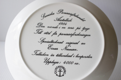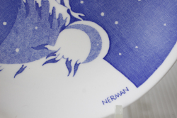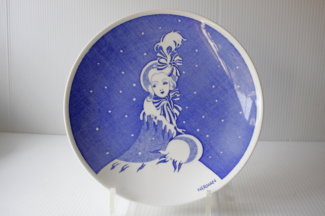 スウェーデン、GUSTAVSBERG(グスタフスベリ)のイヤープレートです。こちらは、Einar Nermanデザインの美しいブルーカラーのプレートで、1976年から1996年まで作られました。こちらはマイフェアレディのような華やかな装いの女性が描かれており、雪が降る中に優しい表情で微笑んでいる姿が美しいです。市場でもほとんど見かけない作品で、限定4000枚で発売されたものですので、コレクターの方には特におすすめです。
