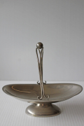 デンマークで見つけたステンレス製の持ち手つきボウルです。こちらは楕円の脚付きのボウルに持ち手が付いたレトロ感溢れるデザインです。持ち手の真ん中にはボールの飾りが付いていて、とても凝っており、ちょっとしたおやつを乗せておもてなしにぴったりのおすすめのボウルです。