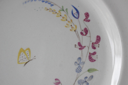 スウェーデン、GUSTAVSBERG(グスタフスベリ)のfloretteシリーズのケーキプレートです。こちらは素朴なタッチのフラワーモチーフに淡いパステルカラーが優しい印象のデザインです。リムの部分にも愛らしいモチーフがデザインされており、春にぴったりのプレートです。こちらのシリーズは、市場でも珍しくお探しの方はどうぞ!同じシリーズのカップ&ソーサーもアップしていますが、プリント、焼成の仕方、質感などをみるとこちらのプレートの方が製造年代は古いと思います。