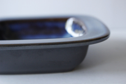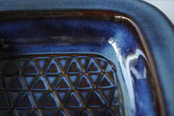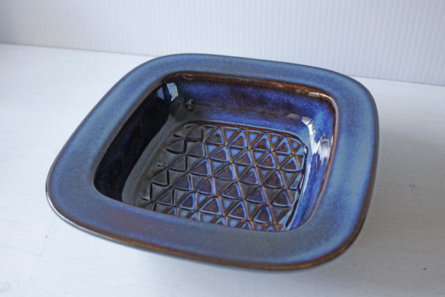 デンマークの小さな島(ボーホルム島)に1835年から1996年まで存在した陶器メーカーSoholm(スーホルム)の角皿です。ぽってりとした厚みのあるフォルム、立体的な幾何学模様がデザインされています。深いブラウンの上に淡いペールブルーが流し込まれたような幻想的な雰囲気です。