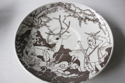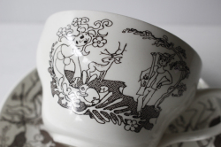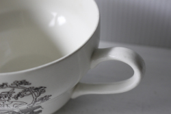 イギリス、Enoch WedgwoodのIrmaシリーズのカップ&ソーサーです。Enoch Wedgwoodは、1965年にイギリスでいろいろな合併の後できたメーカー。1980年に親戚のウェッジウッドに吸収されます。こちらのIrmaシリーズは、1975年~1976年の2年間のみ生産されたレアなものです。シャガールに多大な影響を受けたデンマーク人アーティストLouis Rosen Schmitsによってデザインされた作品です。容量はカップ縁まで入れると500ml入る、とても大きなカップなので、カフェオレやミルクティだけでなく具たくさんのスープを入れるのにもお使いいただけそうです。