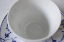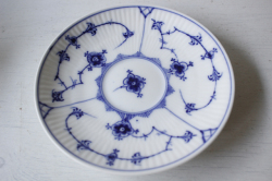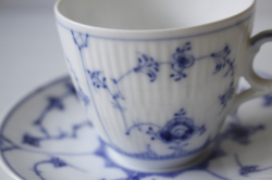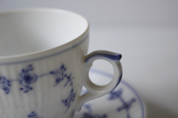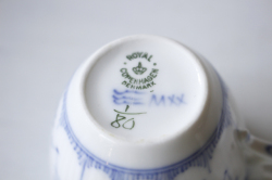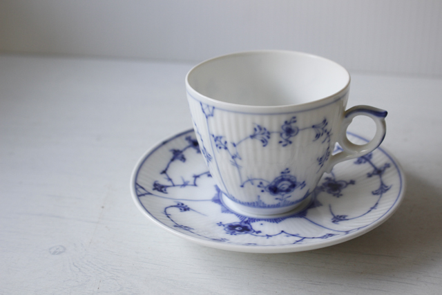 デンマーク、Royal Copenhagenのカップ&ソーサーです。こちらは日本でも人気のある、ブルーフルーテッドシリーズのヴィンテージ品になります。こちらはプレイン。カップとソーサーに可憐なハンドペイントで描かれた可憐な図柄に、ホワイト×ブルーという色合わせの清々しさは、いつの時代も乙女心をくすぐります。職人さんが丹精込めて描いた作品は一つ一つ個性的でロイヤルコペンハーゲンのアイコン的デザインでもあります。古さを感じさせないデザインは現地デンマークでも若い人からお年寄りまで世代を超えて愛されており、食卓を彩っています。現行品の生産はタイに移っています。裏面のバックスタンプにも原産国の証であるDenmarkの文字がはいっています。