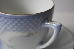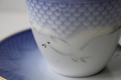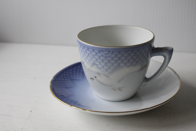デンマークの老舗陶器メーカー、B&Gのカップ&ソーサーです。B&Gの中でも、このシーガル(カモメ)シリーズは、大ヒットし世界中にファンがいます。北欧ブルーの柔らかなお色が淡く全体を包んでいます。淡い美しいグラデーションが北欧らしいデザインで、ハンドペイントでカモメが描かれています。