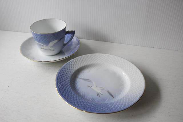 デンマークの老舗陶器メーカー、B&Gのケーキプレートです。B&Gの中でも、このシーガル(カモメ)シリーズは、大ヒットし世界中にファンがいます。北欧ブルーの柔らかなお色が淡く全体を包んでいます。波模様に淡い美しいグラデーションが北欧らしいデザインで、ハンドペイントでカモメが描かれています。
