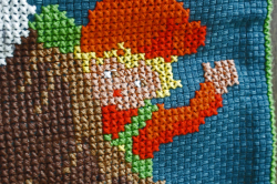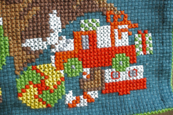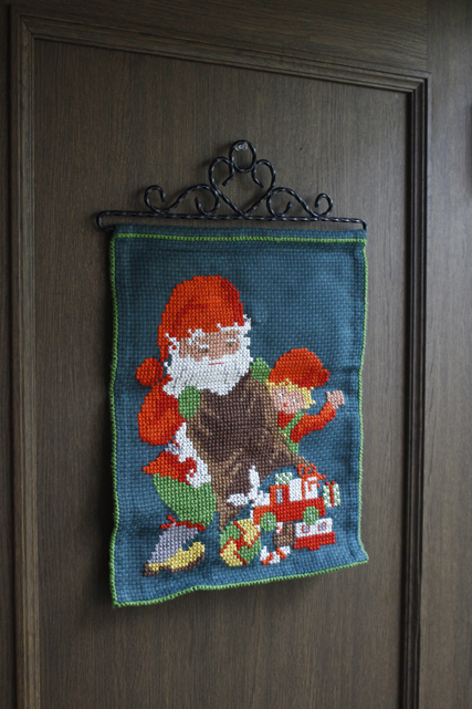 デンマークで見つけた丁寧な手刺繍が施されたヴィンテージの壁掛けです。ざっくりした生地に可愛らしい色合いでクリスマスプレゼントを沢山運んできたサンタのおじいさんの周りにはしゃいでいる男の子がデザインされています。サンタさんの表情と男の子の喜んでいる様子がシュールなクスっと笑ってしまうモチーフです。