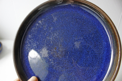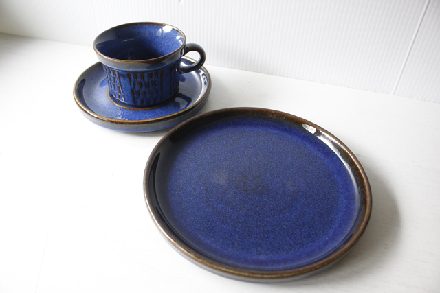デンマーク、Soholm(スーホルム)のケーキプレートです。こちらは、スーホルム社でもっとも有名になった青のシリーズで、ぽってりとした厚みのあるフォルム、ブラウンににブルーが流し込まれたような複雑なお色が浮かび上がってとても美しいです。手作り品のため、釉薬のかかり方に個性があります。カトラリーキズなどコンディションの良いものが見つかりにくいシリーズです。